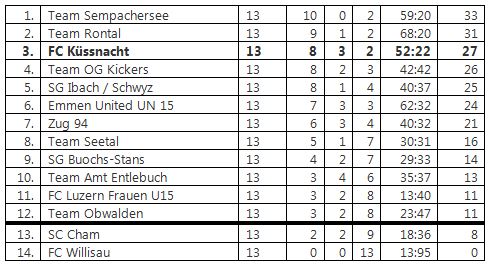 Wenn man bedenkt, dass zu Hause auf den Sportplätzen Ebnet und Luterbach alle 7 Spiele gewonnen wurden und sich darunter auch der Tabellenerste, das Team Sempachersee (4:2) der Zweitplatzierte, das Team Rontal (3:2) befanden, kommen keine Zweifel auf, dass da zweifelsohne eine Topmannschaft am Werke war. Stolz sein kann man ebenfalls auf die Heimsiege gegen den Tabellenvierten, das Team OG Kickers, das man gleich im ersten Spiel ohne „Wenn und Aber“ mit 10:0 Toren niedergerungen und die Fünftplatzierten aus dem Schwyzer Talkessel, die man mit 5:1 bezwungen hat. Einziger Wehmutstropfen waren wohl die unnötigen Auswärtsniederlagen gegen die SG Buochs-Stans (3:1) und die noch blamablere gegen die Juniorinnen U15 des FC Luzern. Kann sich diese tolle Mannschaft in der Hallensaison über den Winter und auch in der Frühjahr/Sommermeisterschaft 2016 mit noch mehr Disziplin und Teamspirit gar verbessern? Gut möglich! Denn auch im C-Junioren Cup ist die Mannschaft mit dem Einzug ins 1/8 Finale noch präsent und immer für eine Überraschung gut.