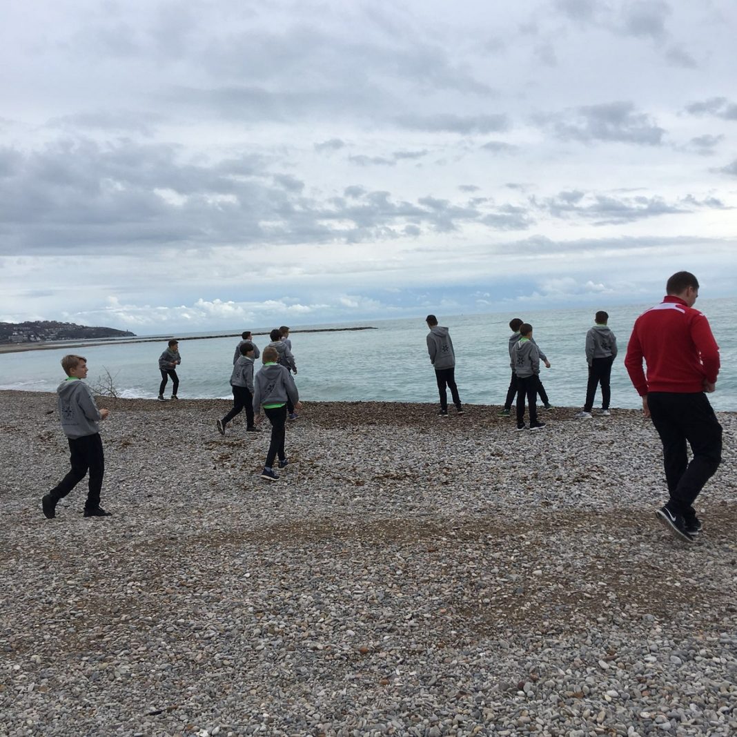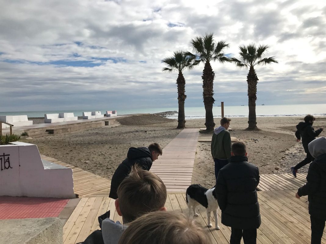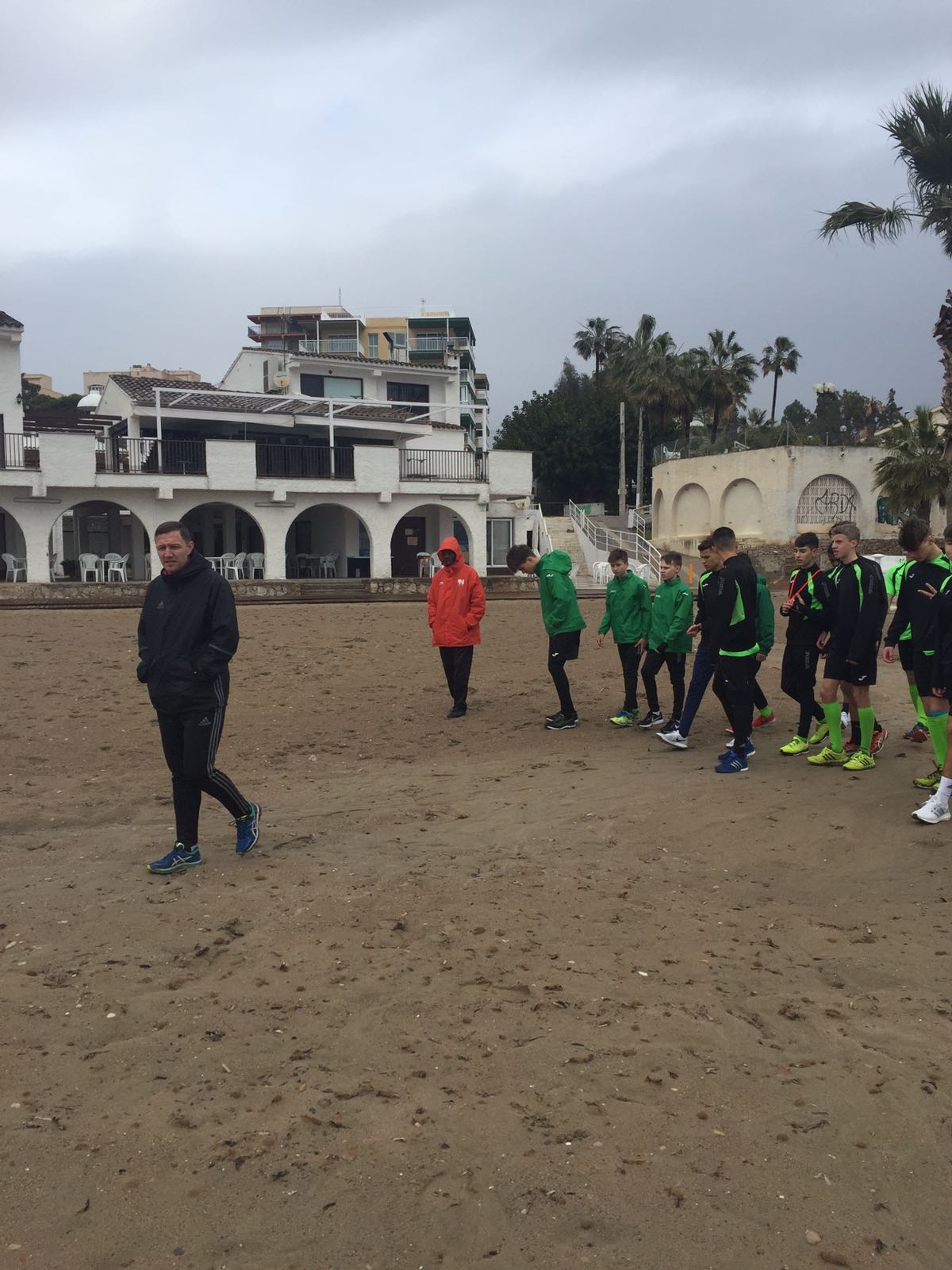 FE-14, Dario, Ramon und Damiano: Auf dem Fussballplatz war es sehr sumpfig, weil es gestern viel geregnet hatte. Wir trainierten am Morgen auf dem Hotelplatz. In einer Übung verletzte sich Ulises unglücklicherweise und ging mit einem geschwollenen Knie zurück zum Hotel. Gute Besserung. Nach dem Mittagessen durften wir noch an den Strand gehen und machten ein paar Fotos. Am Nachmittag fuhren wir mit dem Car zum Fussballplatz und spielten auf dem Kunstrasen. Am Abend vor dem Nachtessen haben noch zwei Gruppen das Zonenspiel analysiert.