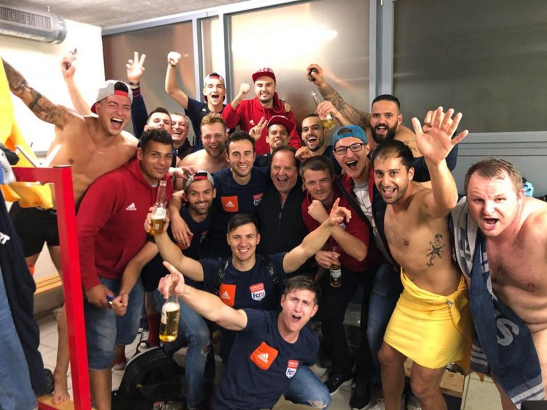 Da der FCR, der nun zur Sicherung des knappen Vorsprungs in Unterzahl etwas tiefer stand, seine Konter aber nicht mit der letzten Konsequenz zu Ende spielte, musste der Schlusspfiff eher unnötig erdauert werden. In der 96.! Minute (es waren eigentlich keine langen Verletzungspausen oder Trinkpausen nachzuspielen) lancierte FCR Hüter Bernasconi mit einem präzisen Auskick schliesslich den schnellen Ranzenberger. Dieser setzte sich gegen die aufgerückte Algro Abwehr durch und schoss mit seinem Treffer in zum 4:2 ins verwaiste Algro-Tor den FC Rotkreuz definitiv ins Glück denn kurz darauf pfiff SR Matosevic den Match dann tatsächlich doch noch ab…und Rotkreuz fand sich erstmals in der diesen Sommer 60-jährigen Vereinsgeschichte in der höchsten regionalen Liga wieder! Als nach dem Bekanntwerden der anderen Resultate feststand, dass der FCR den Aufstieg soeben eine Runde vor Schluss geschafft hatte, gab es kein Halten mehr und die improvisierte, unerwartete vorzeitige Aufstiegsfeier konnte beginnen. Herzliche Gratulation FC Rotkreuz zum Aufstieg in die regionale 2. Liga!