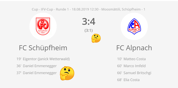 Innerhalb von zehn Minuten reagierte der FC Alpnach vehement auf den Rückstand. Der Anschlusstreffer gelang Marco Imfeld nach einer Hereingabe von Kevin Blättler, der Ausgleich erzielte Samuel Britschgi vom Penaltypunkt und für das umjubelte 4:3 war der eingewechselte Elia Costa zuständig. Drunter und drüber – Episode 2.