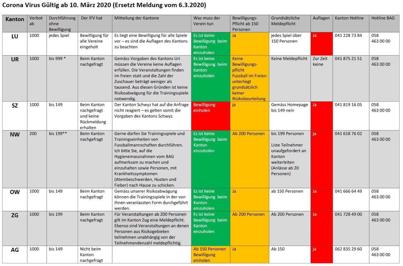 Auf dem Gebiet des Innerschweizerischen Fussballverbandes (IFV) besteht bezüglich des Umgangs mit dem Coronavirus noch keine Harmonisierung. Aus diesem Grund empfiehlt der IFV für den Fussballspielbetrieb die Weisungen der jeweiligen Kantone zu beachten.
