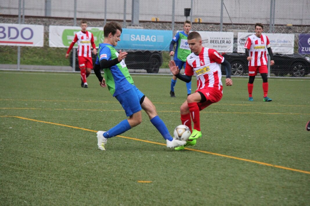 Gegen einen stark einzustufenden Gegner darf Küssnacht, hier mit Kevin Schilliger (links) im Duell mit Nedal Ahmad, mit dem 2:2 durchaus zufrieden sein (Bild: Mateo Landolt).