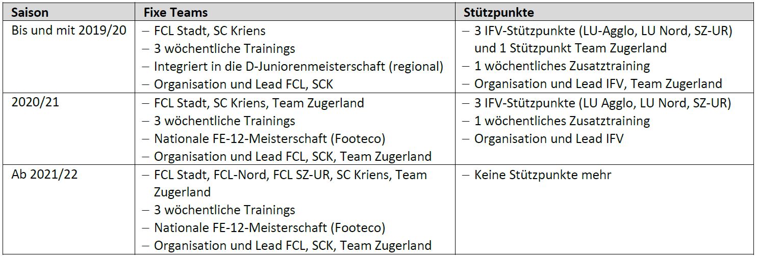 Wie der Tabelle zu entnehmen ist, hat es in den Regionen Luzern-Nord und SZ-UR auf die Saison 2021/22 neu je ein FE-12-Team. Im Gegenzug dazu werden in den beiden Regionen keine IFV-Stützpunkte mehr geführt. Das heisst auch, dass die Stufe FE-12 ganz in die Obhut des Team Innerschweiz übergehen wird.