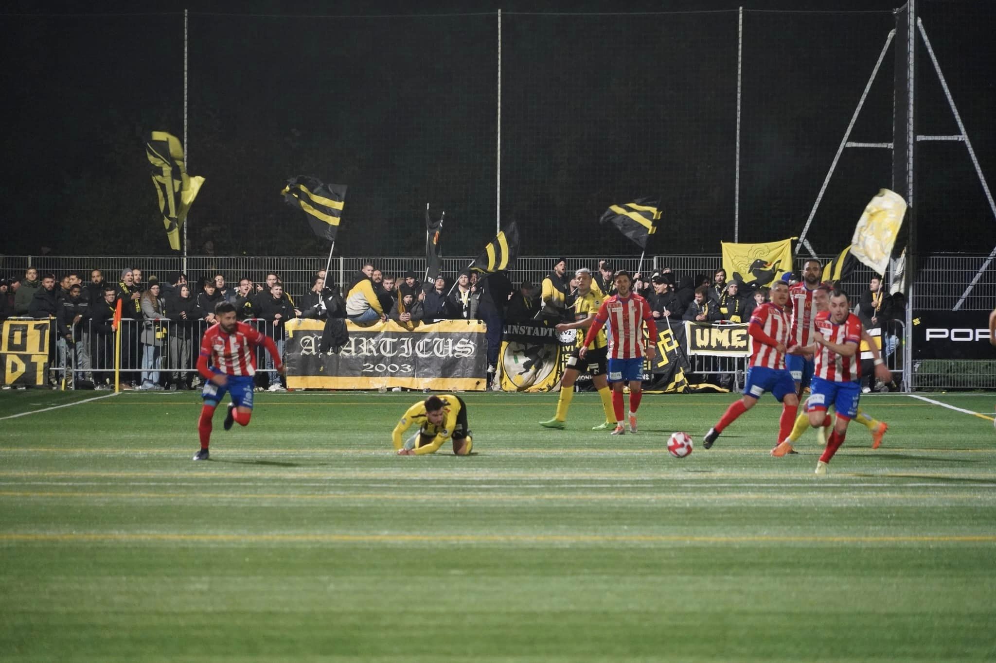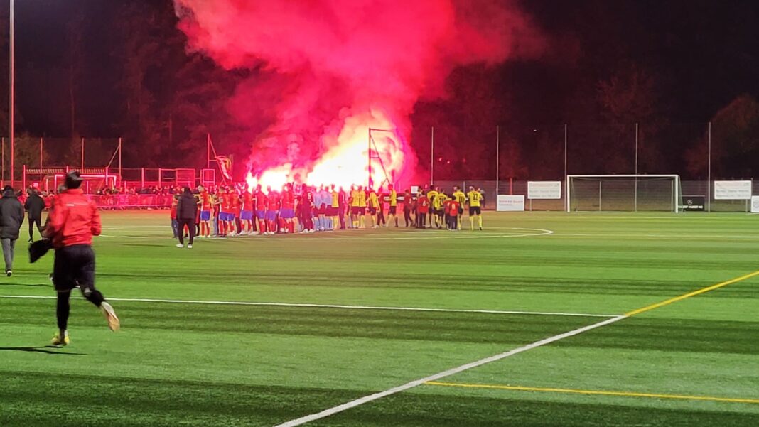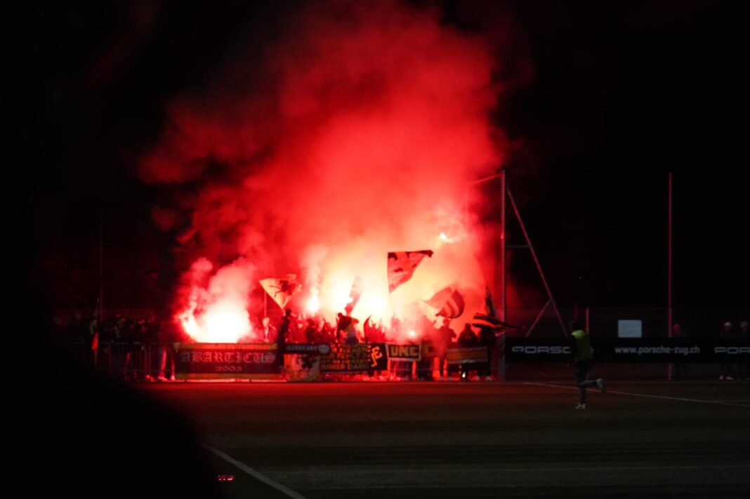 Die Stimmung kochte, die 100 mitgereisten Schaffhauser Fans nebelten den eh nicht sonderlich hell ausgeleuchteten Platz fleissig mit Rauch aus mitgebrachtem Pyromaterial ein (Bild: FC Rotkreuz).