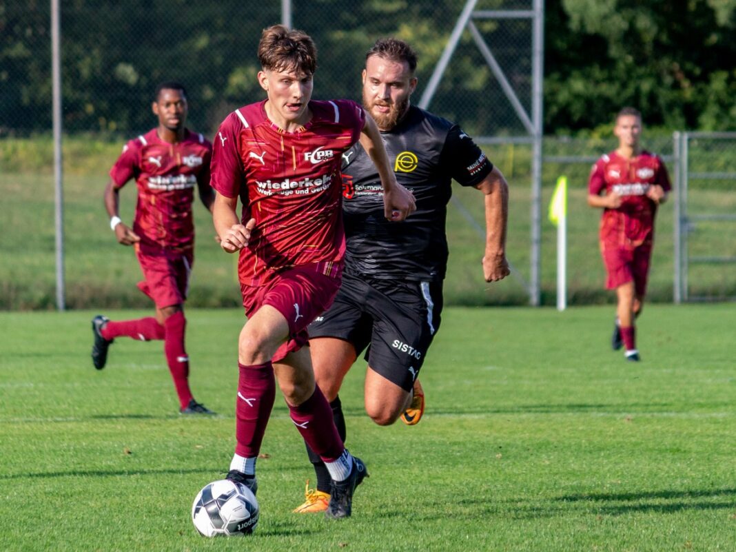 Perlens Sturmspitze Lorin Mirashi (am Ball) entwischt dem Eschenbacher Goran Stojanov beim Start in diese Saison im August 2022 (Archivbild: Daniel Gerber).