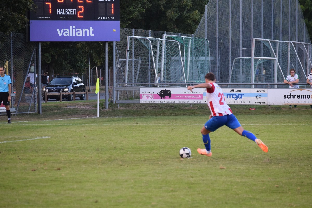Beim ersten Auswärtsspiel der Saison in Sempach trat der FC Küssnacht gezwungenermassen mit einer stark veränderten Startelf und improvisierter Abwehrreihe an. Unter anderem durfte Gjon Komani sein Debüt im FCK-Dress geben. Zudem kehrte Cheftrainer Christian Kunz aus den Ferien auf die Trainerbank zurück. Sein Team begann ziemlich zögerlich und liess in der 6. Minute bereits die erste Chance für die Gastgeber zu, doch Morris Gügler verhinderte vorerst Schlimmeres. Nach dem anschliessenden Eckball war er beim wuchtigen Kopfball von Luca Bühler chancenlos und es stand nach sieben Minuten bereits 1:0.