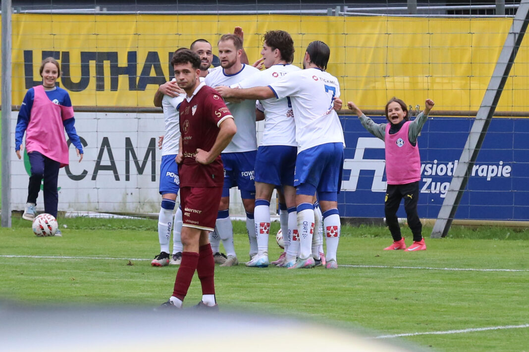 Doch wie schon in Langenthal vermochten die Zuger sofort zu reagieren. Mehr oder weniger mit dem nächsten Angriff fiel schon der Ausgleich. Der Schiedsrichter liess nach einem Foul an einem Zuger im Mittelfeld Vorteil laufen – zum Glück für das Heimteam. Dein Barreiro setzte sich am linken Flügel bei der Grundlinie durch und flankte hoch Richtung zweiter Pfosten. Dort stand Diego Martin goldrichtig und brauchte nur noch einzunicken.
