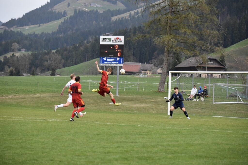 Zu Beginn der Partie war beiden Mannschaften eine gewisse Nervosität anzumerken. Zusätzlich erschwerte der – aufgrund des späten Schneefalls über Ostern – schwierig bespielbare Platz ein sauberes Kombinationsspiel. Die Startphase war daher geprägt von Ballverlusten, intensiven Zweikämpfen und vielen Luftduellen. Die erste gute Gelegenheit gehörte dem Heimteam: Oliver Greil umkurvte nach einem Steilpass den Schüpfheimer Torhüter Noah Unternährer, scheiterte mit seinem Abschluss jedoch an der Torumrandung.